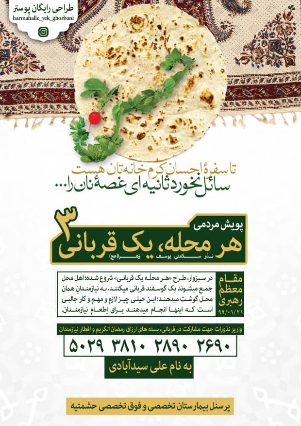 هر ساله ماه رمضان که میشد سفرهای نذری افطاریمون به راه بود ، هر کسی به اندازه وسعش. ولی صد حیف که با امدن این مریضی منحوس دیگر خبری از این سفره های با صفا نیست ... مریضی که با امدنش خیلی از خانواده های کم درآمد آسیب پذیرتر و خانواده های فقیر هم ضعیف تر شدند .خانواده هایی که همیشه روزه اند چون چیزی برای خوردن ندارند... پویش هر محله یک قربانی حرکت نابی است که از سمت همشهری های خودمان شروع شده است ، حرکت متمرکزی برای اینکه بتوانیم با همت هم گوشه ای از درد همشهریان نیازمندمان را در این ماه مهربانی التیام بخشیم ... درست که فعلا نمی توان دور سفره های رنگی افطارمان جمع شویم ولی بیاییم با همت هم در خانه هر نیازمند یک سفره افطار بر پا کنیم... روابط عمومی بیمارستان تخصصی و فوق تخصصی حشمتیه