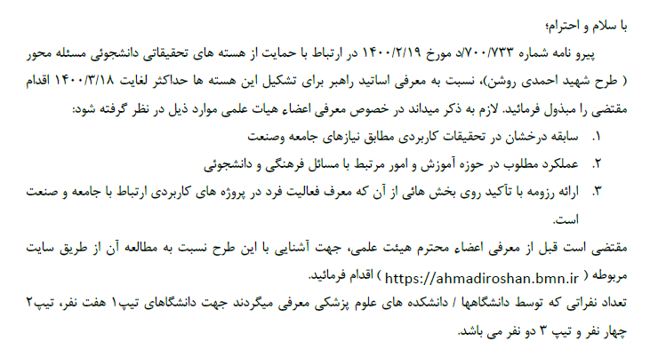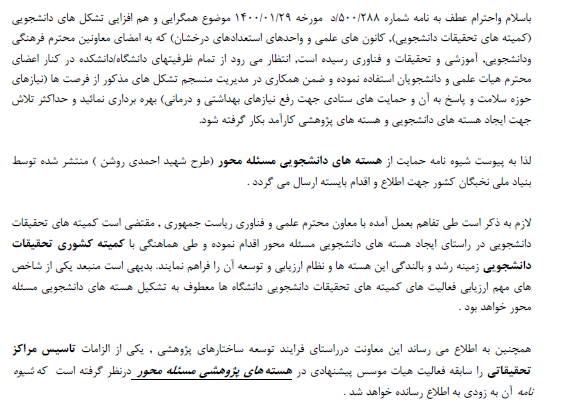 روابط عمومی معاونت تحقیقات و فناوری دانشگاه؛ حمایت از هسته های تحقیقاتی دانشجوئی مسئله محور(طرح شهید احمدی روشن)