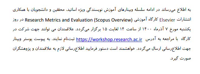 روابط عمومی معاونت تحقیقات و فناوری دانشگاه؛ برگزاری وبینار Research Metrics and Evaluation