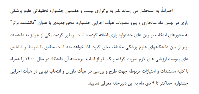 روابط عمومی معاونت تحقیقات و فناوری دانشگاه؛ محور جدیدی با عنوان " دانشمند برتر" در جشنواره رازی