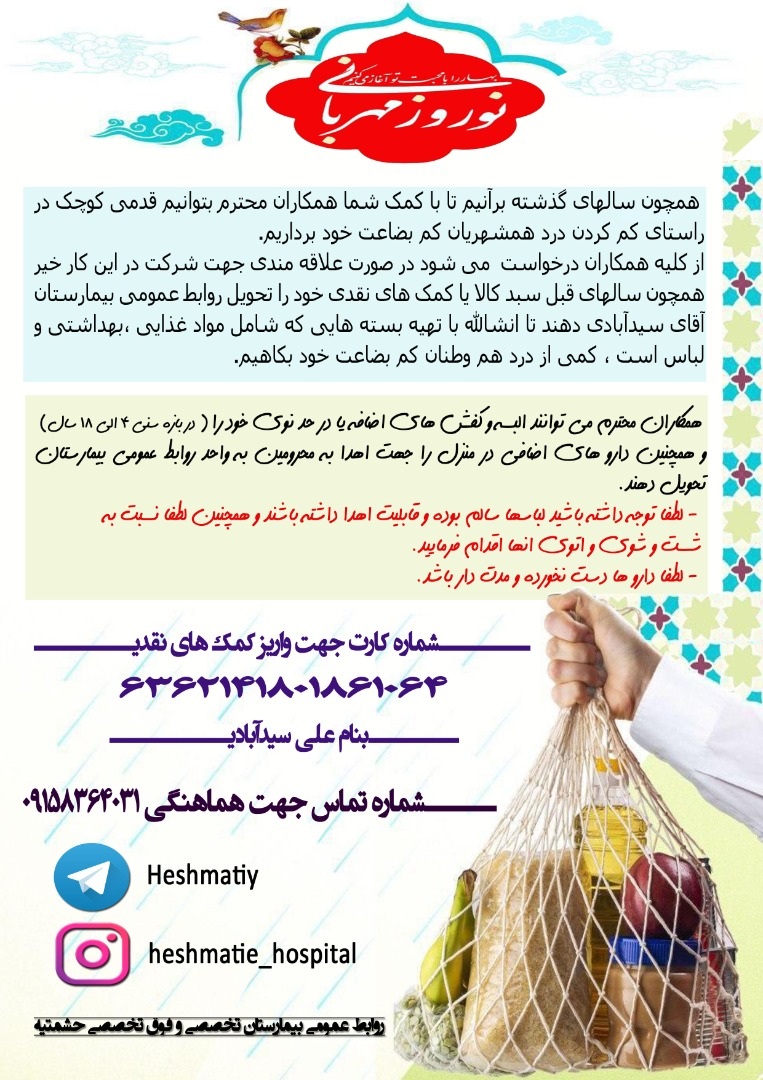 همچون سالهای گذشته برآنیم تا با کمک شما همکاران محترم بتوانیم قدمی کوچک در راستای کم کردن درد همشهریان کم بضاعت خود برداریم. ❇️از کلیه همکاران درخواست می شود در صورت علاقه مندی جهت شرکت در این کار خیر همچون سالهای قبل سبد کالا یا کمک های نقدی خود را تحویل روابط عمومی بیمارستان آقای سیدآبادی دهند تا انشالله با تهیه بسته های که شامل مواد غذایی ،بهداشتی و لباس بتوان کمی از درد هم وطنان کم بضاعت خود بکاهیم.