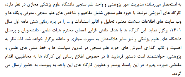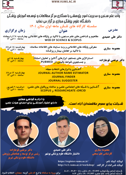 روابط عمومی معاونت تحقیقات و فناوری دانشگاه؛ برگزاری کارگاه های شش ماهه اول سال 1401 واحد علم سنجی مدیریت امور پژوهشی دانشگاه علوم پزشکی مجازی