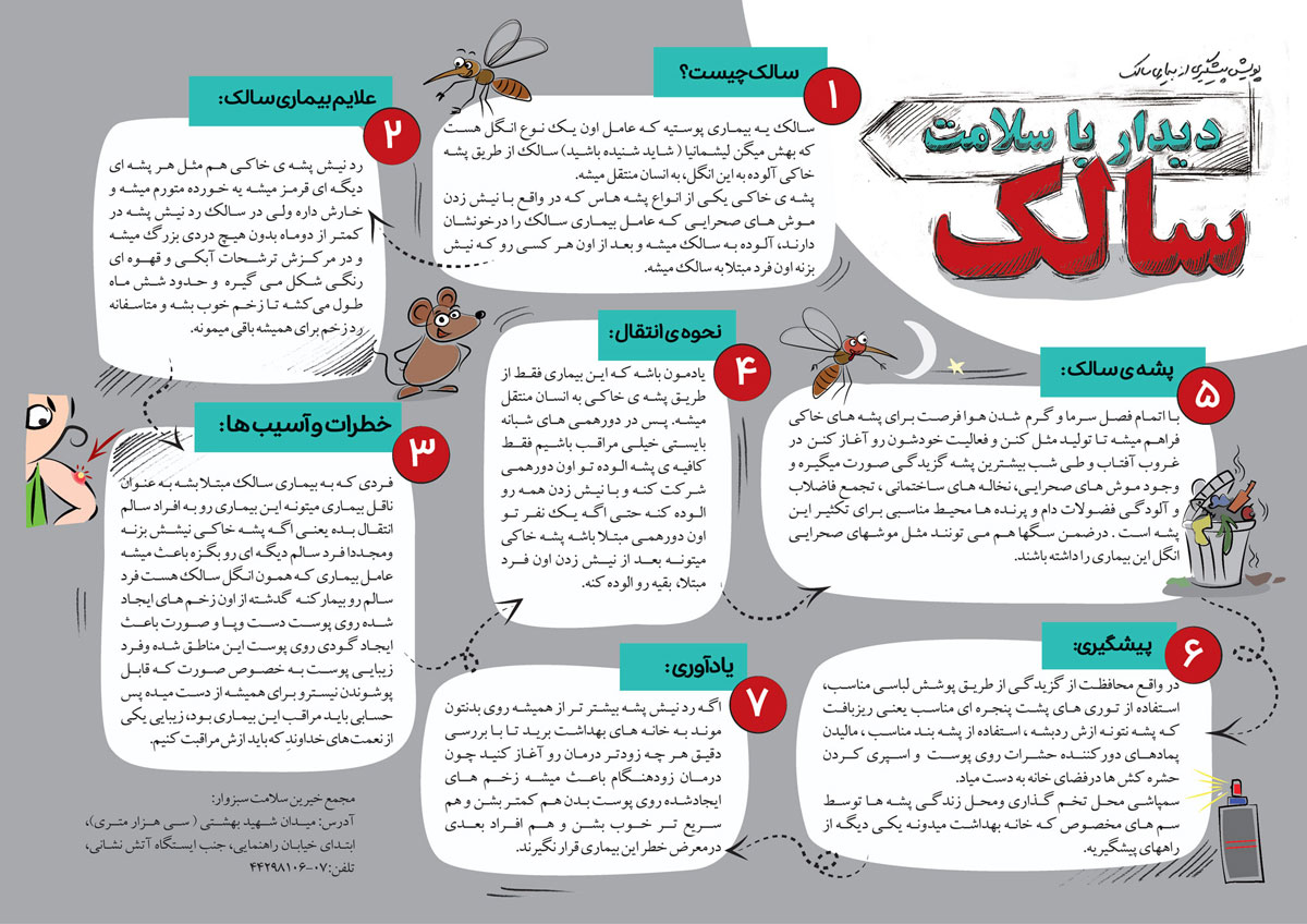 پیشگیری از بیماری سالک پیشگیری از بیماری سالک بیماری سالک چیست؟ آیا با بیماری پوستی سالک آشنا هستید؟ جهت آشنایی با این بیماری،روش های انتقال و پیشگیری لطفا بر روی "بیشتر بخوانید"کلیک کنید.