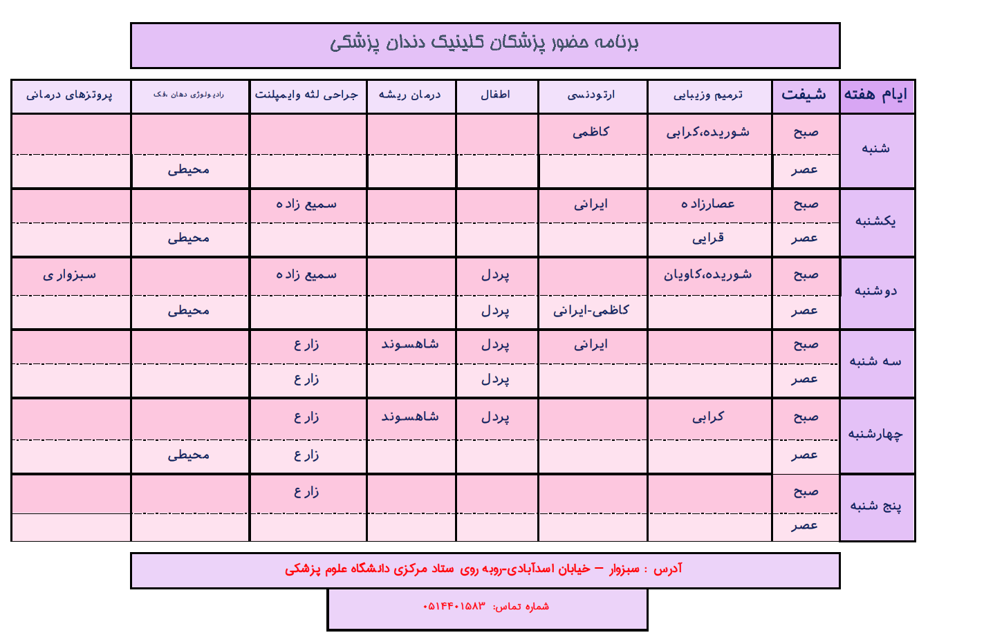 برنامه حضور دندان پزشکان کلینیک ویژه برنامه حضور دندان پزشکان کلینیک ویژه به استحضار همشهریان گرامی می رساند برنامه حضور دندان پزشکان کلینیک ویژه در تیرماه 1401با تعرفه دولتی به شرح زیر می باشد: