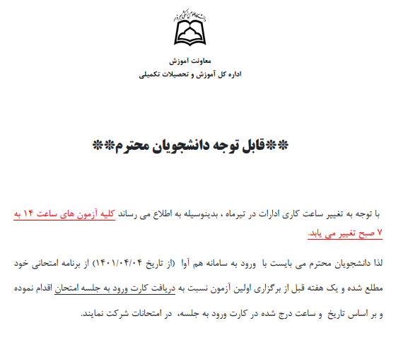 روابط عمومی معاونت آموزشی دانشگاه؛ اطلاعیه تغییر ساعت آزمون های پایان ترم (تیر 1401)