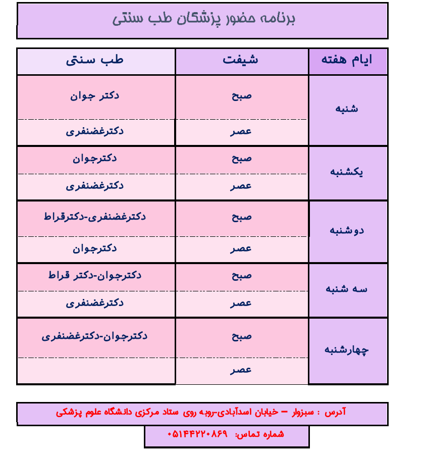 برنامه حضور پزشکان کلینیک طب سنتی برنامه حضور پزشکان کلینیک طب سنتی به استحضار همشهریان عزیز می رساند برنامه حضور پزشکان کلینیک طب سنتی به شرح زیر است و خدمات قابل ارائه شامل : طب سوزنی، زالودرمانی،حجامت،داروخانه طب سنتی،فصد،مشاوره تغذیه،رژیم و ویزیت می باشد.