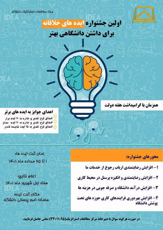 نخستین جشنواره دانشگاهی ایده های خلاقانه برای داشتن دانشگاهی بهتر نخستین جشنواره دانشگاهی ایده های خلاقانه برای داشتن دانشگاهی بهتر به همت مرکز مطالعات استراتژیک و با هدف مشارکت پرسنل در فعالیت های دانشگاه، حمایت و تشویق کارکنان، استفاده از ظرفیت های فکری در جهت ارتقای سطح کیفی خدمات ، توسعه و ترویج ایده پروری و هدایت ایده های خلاق و نوآور به سمت اجرائی شدن و شناسایی مشکلات و نیازهای گروه های مختلف شغلی برگزار می شود. شناسایی راهکارهای خلاقانه در جهت رفع مشکلات و افزایش بهره وری، تشویق ایده ها در جهت الگو سازی و تشویق سایر کارکنان، زمینه سازی به منظور هم افزایی میان پرسنل و مدیران دانشگاه و ایجاد بستر به منظور آشنایی مدیران با توانمندی پرسنل از دیگر اهداف این جشنواره خواهد بود. افزایش رضایت مندی و انگیزه پرسنل در محیط کاری، افزایش رضایتمندی ارباب رجوع از خدمات، افزایش بهره وری فرآینده های کاری حوزه های تحت پوشش از محورهای این جشنواره می باشد. اعلام فراخوان شرکت در این جشنواره از ابتدای مرداد ماه سال جاری لغایت 25 مرداد ماه انجام و داوری ایده ها و اعلام نتایج نیز در پایان مرداد ماه اجرائی خواهد شد. معیارها و شاخص های ارزیابی ایده ها براساس فرم امتیاز دهی وزارت بهداشت تدوین شده که در قالب فرم داوری جشنواره در اختیار داوران قرار می گیرد. پس از داوری ایده های دریافتی از 10 ایده برتر، 10 ایده ممتاز و 15 ایده شایسته تقدیر، طی مراسمی در هفته اول شهریور ماه همزمان با هفته دولت و روز کارمند تقدیر به عمل خواهد آمد. متقاضیان علاقه مند به شرکت در جشنواره ایده های خلاقانه می توانند ایده های خود را در سامانه امور پرسنلی دانشگاه ثبت کرده و در صورت هر گونه سوال با شماره تلفن 44011059 دبیرخانه مرکز مطالعات استراتژیک دانشگاه تماس حاصل فرمایند.