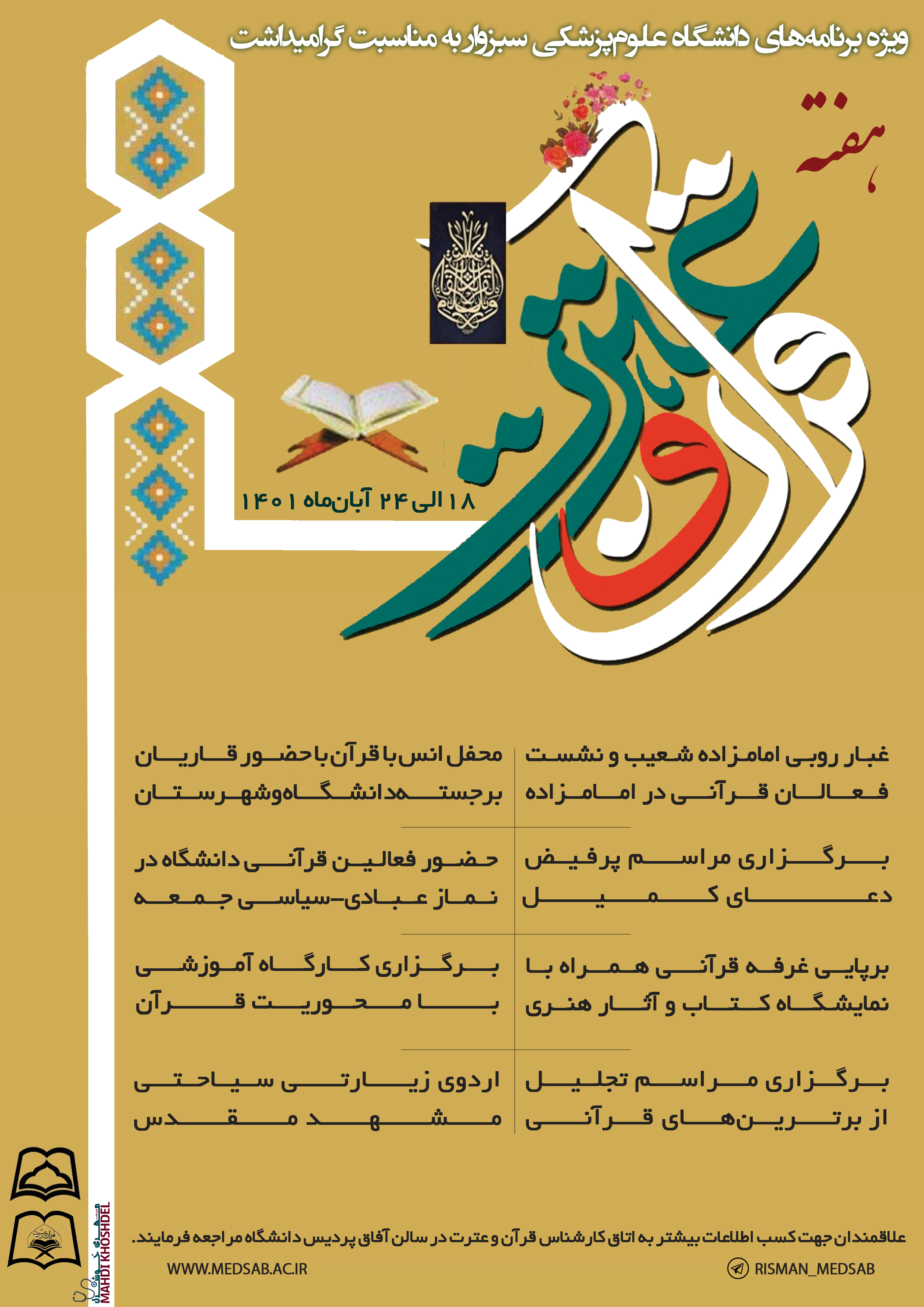 برنامه های هفته قرآن و عترت دانشگاه علوم پزشکی سبزوار اعلام شد مدیر تعالی فرهنگی دانشگاه به مناسبت گرامیداشت هفته قرآن و عترت دانشگاه های علوم پزشکی کشور از برگزاری برنامه های متعدد فرهنگی و قرآنی خبر داد. به گزارش مفدا سبزوار، مهدی سلمانیان مدیر تعالی فرهنگی و فوق برنامه دانشگاه ضمن گرامیداشت هفته قرآن و عترت اظهار داشت: ۱۸ الی ۲۴ آبان ماه که مصادف با ایام رحلت مفسر بزرگ قرآن کریم مرحوم علامه طباطبایی (ره) می باشد از سوی شورای هماهنگی فعالیت های قرآن و عترت دانشگاه ها به عنوان هفته قرآن و عترت دانشگاه ها نامگذاری شده است. وی برگزاری محفل انس با قرآن کریم با حضور مبلغین و اساتید قرآنی در محل امامزاده شعیب بن موسی (ع) و همچنین غبارروبی مضجع شریف امامزاده، حضور دانشجویان در نماز جمعه ، برگزاری مراسم پرفیض دعای کمیل در خوابگاه، برگزاری کارگاه آموزشی با محوریت قرآن در طول هفته ، برپایی غرفه قرآنی و نمایشگاه کتاب و آثار هنری در دانشگاه، برگزاری تجلیل از فعالین و برترین های قرآنی دانشگاه، برپایی اردوی زیارتی به مشهد مقدس را از جمله برنامه های این هفته معرفی و بر اجرای آن تاکید نمود.