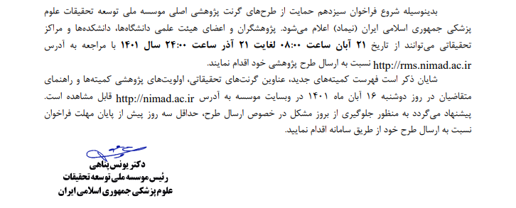 روابط عمومی معاونت های آموزشی، تحقیقات و فناوری دانشگاه؛ فراخوان سیزدهم حمایت از طرح های گرنت پژوهشی اعلام فراخوان سیزدهم گرنت های اصلی (آبان 1401) موسسه نیماد