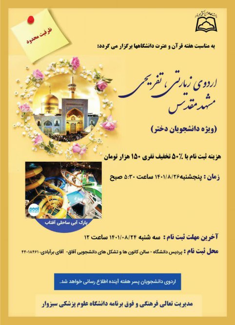 به مناسبت هفته قرآن و عترت دانشگاهیان اردوی زیارتی ، تفریحی مشهد مقدس ویژه دانشجویان دختر دانشگاه برگزار می گردد علاقه مندان به شرکت در این اردو می توانند جهت ثبت نام به سالن آفاق (کانون ها و تشکل های دانشجویی) آقای برآبادی مراجعه نمایند. آخرین مهلت ثبت نام سه شنبه ۲۴ آبان ماه ساعت ۱۲ می باشد و هزینه ثبت نام با تخفیف ۵۰% نفری ۱۵۰ هزار تومان می باشد