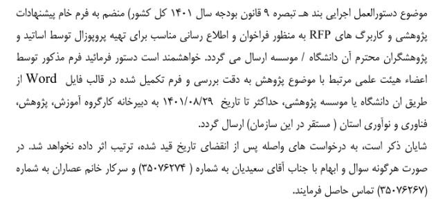 روابط عمومی پردیس دانشگاه؛ فرم پیشنهادات پژوهشی جهت فراخوان و تهیه پروپوزال اساتید فرم پیشنهادات پژوهشی جهت فراخوان و تهیه پروپوزال اساتید ( سازمان مدیریت و برنامه ریزی مشهد ) پیشنهاد پژوهشی (Proposal) مرتبط با اعتبارات پژوهشی دستگاه های اجرایی مشمول نظام بودجه استانی (موضوع ماده 6دستورالعمل اجرایی بند(هـ)تبصره(9) قانون بودجه سال 1401) مشخصات مجری طرح: نام و نام خانوادگی: محل تولد: تاريخ تولد: كد ملي: نوع اشتغال: دولتی £ خصوصی £ تعاونی£ سایر£ دانشگاه/موسسه پژوهشی محل اشتغال: :اشتغال مرتبه علمی: مربی£ استادیار£ دانشیار£ استاد£ سایر£ آدرس و تلفن منزل: آدرس و تلفن محل کار: پست الکترونیکی و تلفن همراه: سوابق تحصيلات دانشگاهي مجری طرح: ردیف مدرك تحصيلي رشته تحصيلي گرایش دانشگاه محل اخذ مدرک سال اخذ 1 کارشناسی 2 کارشناسی ارشد 3 دکتری سوابق مهمترین فعاليتهاي پژوهشی مجری (با الویت انجام پژوهش برای دستگاه های اجرایی) : ردیف عنوان پژوهش انجام شده اداره يا مؤسسهاي كه پژوهش براي آنجا انجام گرفته است سال انجام 1 2 3 4 5 مشخصات همكاران پژوهش(در صورت وجود همکار تکمیل شود): رديف نام و نام خانوادگي كد ملي تاريخ تولد مرتبه علمی محل اشتغال نوع اشتغال نوع همكاري 1 2 3 4 5 بخش دوم: اطلاعات مربوط به طرح پژوهشی (مورد تقاضا) عنوان پژوهش به فارسی: عنوان پژوهش به انگلیسی: نوع پژوهش: بنیادی£ کاربردی£ توسعهای£ زمینه پژوهش: فنی و مهندسی£ علوم پایه£ علوم انسانی£ هنر و معماری£ بهداشت و درمان£ صنعت و معدن£ آب و کشاورزی £محیط زیست و منابع طبیعی£ سایر .......................... بيان مسأله پژوهش، شامل: - پايههاي علمی و نظري مساله پژوهش - زمينه، علل و گستردگي مساله - وضعيت موجود مساله در جامعه مورد تحقيق - اشاره به علل احتمالي بروز مساله و تناقضات مساله - ختم به سوال/ سوالهاي پژوهشي - تعریف کلید واژهها ضرورت انجام پژوهش، شامل: - اشاره به ضرورت موضوع تحقيق - اشاره به ضرورت اجراي تحقيق در جامعه هدف - اشاره به پيامدها مساله و كابرد احتمالي نتايج اهداف پژوهش: - هدف كلي - اهداف جزئي(نتایج و دستاوردهای طرح) فرضيهها يا سوالهاي اساسی پژوهش: مباني نظري پژوهش: - اشاره به تئوريهاي مرتبط - اشاره به تازهترين پژوهشهاي مرتبط پيشينه پژوهش، شامل: - سابقه اجرای طرح و مهم ترین نتایج حاصله در ایران و سایر کشورها (جمع بندی از پیشینه های پژوهشی) متغيرهاي پژوهش، شامل: مستقل، وابسته، تعديلگر، كنترل، مزاحم و نوع از لحاظ كمي و كيفي بودن مشخص شود. روش انجام پژوهش، شامل: - روش تحقيق (ذكر روش پژوهش مورد استفاده با دلايل منطقي) - ابزار گردآوري داده ها (بيان چگونگي ساخت، آزمايش و تعيين روايي و پايايي آن، ابزار بايد در ارتباط با متغيرها بوده و اطلاعات لازم را در مورد متغيرها جمعآوري كند) - تعريف جامعه پژوهشي - حجم نمونه و شيوه نمونهگيري - روشهای آماری مورد استفاده (روشهاي آماري با سطوح اندازهگيري، سوالها و فرضيههاي تحقيق هماهنگ باشد و روش مناسب براي هر سوال يا فرضيه مشخص شود) منابع و مأخذ: بخش سوم: زمان بندی مراحل ا نجام پژوهش درصد زمان تقريبي اجراي هر مرحله تاريخ تقريبي ارائه گزارش پيشرفت كار نحوه گزارش نتايج كتبي/ شفاهي/ استفاده از وسايل ديداري فصل ماه هفته 1 2 3 4 5 6 7 8 9 10 بخش چهارم: برآورد هزينهها جدول 1. هزينههاي نيروي انساني نوع مسئوليت 1 2 3 تعداد ساعات كار در هفته 4 جمع ساعات كار 5 حقالزحمه هر ساعت 6 7 1 2 3 4 5 جمع كل جدول 2. هزينههاي مواد، وسايل و امكانات رديف شرح كامل لوازم و مواد مصرفي مورد نياز تعداد یا مقدار قيمت واحد (ریال) قيمت كل (ریال) 1 2 3 4 5 جمع کل جدول 3. سایر هزينهها: ردیف اقلام هزينه قيمت کل (ریال) 1 2 3 4 5 6 7 8 9 10 جمع کل جدول 4. جمع کل هزينهها ردیف نوع هزينهها ريال 1 هزينههاي نيروي انساني 2 هزينههاي مواد ، وسايل و امكانات 3 سایر هزينهها جمع كل هزينههاي پژوهش نام و نام خانوادگي ارائه دهنده پيشنهاد: امضاء تاریخ: