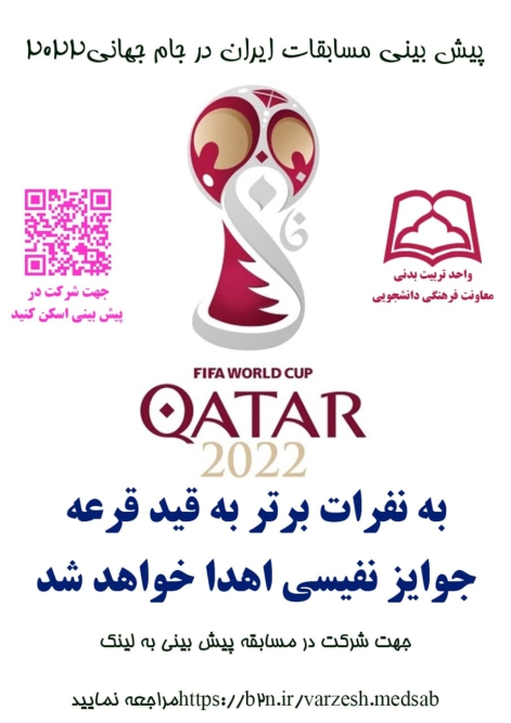 ورزشی به همت واحد تربیت بدنی معاونت فرهنگی دانشجویی برگزار می شود: پیش بینی نتایج تیم ملی ایران در جام جهانی ۲۰۲۲ مسابقه پیش بینی نتایج تیم ملی ایران در جام جهانی ۲۰۲۲ در دو سطح دانشجویان ، اساتید و کارکنان برگزار خواهد شد . رحیمی مسئول محترم واحد تربیت بدنی دانشگاه گفت: مسابقه پیش بینی نتایج تیم ملی ایران در جام جهانی ۲۰۲۲ در دو سطح دانشجویان ، اساتید و کارکنان برگزار خواهد شد . رحیمی با اشاره به اهدای جوایز نفیس به شرکت کنندگان در مسابقه افزود: علاقه مندان شرکت در مسابقه می توانند تا قبل از شروع هر بازی تیم ملی کشورمان با مراجعه به لینک https://b2n.ir/varzesh.medsab در این مسابقه شرکت نمایند.