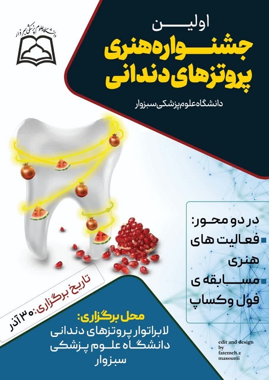 روابط عمومی پردیس دانشگاه؛ اولین جشنواره هنری پروتزهای دندانی اولین جشنواره هنری پروتزهای دندانی در دانشگاه علوم پزشکی سبزوار برگزار می گردد. اولین جشنواره هنری پروتزهای دندانی در دو محور فعالیت های هنری و مسابقه ی فول وکساپ تا تاریخ 30 آذر ماه در محل لابراتوار پروتزهای دندانی دانشگاه برگزار می گردد. در پایان به نفرات برگزیده هدایای نفیس اهدا میگردد.