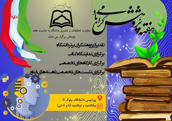 معاونت تحقیقات فناوری دانشگاه برگزار میکند؛ مراسم تقدیر و تجلیل از پژوهشگران و فناوران برتر دانشگاه زمان و مکان: یکشنبه چهارم دی ماه ساعت 9 سالن دکتر سیادتی از همه سروران ارجمند، پژوهشگران و محققین گرامی جهت شرکت در مراسم دعوت بعمل می آید. در حاشیه گرامیداشت نمایشگاه کتاب و دستاوردهای پژوهش و کارگاههای تخصصی برگزار می گردد.