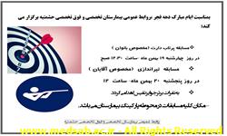 بمناسبت ایام مبارک دهه فجر ،روابط عمومی بیمارستان تخصصی و فوق تخصصی حشمتیه برگزار می کند: *مسابقه پرتاب دارت (مخصوص بانوان ) در روز چهارشنبه 19 بهمن ماه -ساعت 12:30 صبح *مسابقه تیراندازی (مخصوص آقایان ) در روز پنجشنبه 20 بهمن ماه- ساعت 12 *به نفرات برتر جوایز نفیس اهدا می گردد. -مکان کلیه مسابقات در محوطه پارکینگ بیمارستان می باشد.