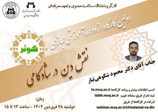 روابط عمومی معاونت آموزشی دانشگاه؛ کارگروه اخلاق، سلامت معنوی و تعهد حرفهای کارگاههای دوره آموزشی مجازی کوثر در سال 1402دانشگاه علوم پزشکی قم کارگروه اخلاق، سلامت معنوی و تعهد حرفهای کارگاههای دوره آموزشی مجازی کوثر در سال 1402 کارگاههای دوره آموزشی مجازی کوثر در سال 1402 دانشگاه علوم پزشکی قم کارگروه اخلاق، سلامت معنوی و تعهد حرفهای ردیف عنوان مدرس تاریخ 1 نقش دین در شادکامی آقای دکتر شکوهی تبار 28 فروردین 2 ایده پردازی در حوزه اخلاق و سلامت معنوی خانم دکتر احمری طهران 25 اردیبهشت 3 جستجو در منابع و پایگاههای اطلاعاتی عمومی و تخصصی در حوزه اخلاق و سلامت معنوی آقای دکتر حیدری 29 خرداد 4 طراحی، اعتبارسنجی و اجرای مداخلات معنوی خانم دکتر طاهری خرامه 26 تیر 5 ارزشیابی برنامههای مداخلهای در حوزه سلامت معنوی خانم دکتر احمری طهران 30 مرداد 6 طراحی و روانسنجی ابزارهای سنجش سلامت معنوی خانم دکتر طاهری خرامه 27 شهریور 7 آشنایی با مفاهیم مراقبت معنوی خانم دکتر حیدری 24 مهر 8 پیش درآمد مراقبت معنوی خانم دکتر طاهری خرامه 29 آبان 9 مراقبت معنوی در خدمات سلامت خانم دکتر طاهری خرامه 27 آذر 10 حرفهایگری و اخلاق پزشکی آقای دکتر مشکوری 25 دی 11 اخلاق در آموزش آقای دکتر آسایش 30 بهمن 12 اخلاق در پژوهش آقای دکتر رضایی آدریانی 21 اسفند ساعت برگزاری: 13 الی 15