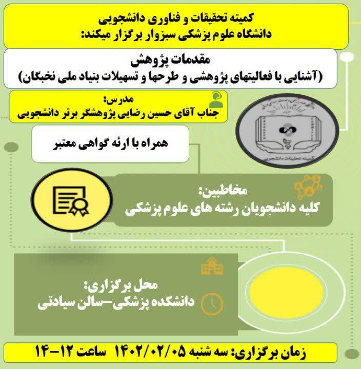 کمیته تحقیقات دانشجویی برگزاری کارگاه مقدمات پژوهش مقدمات پژوهش (آَشنایی با فعالیت های پژوهشی و طرح ها و تسهیلات بنیاد ملی نخبگان)