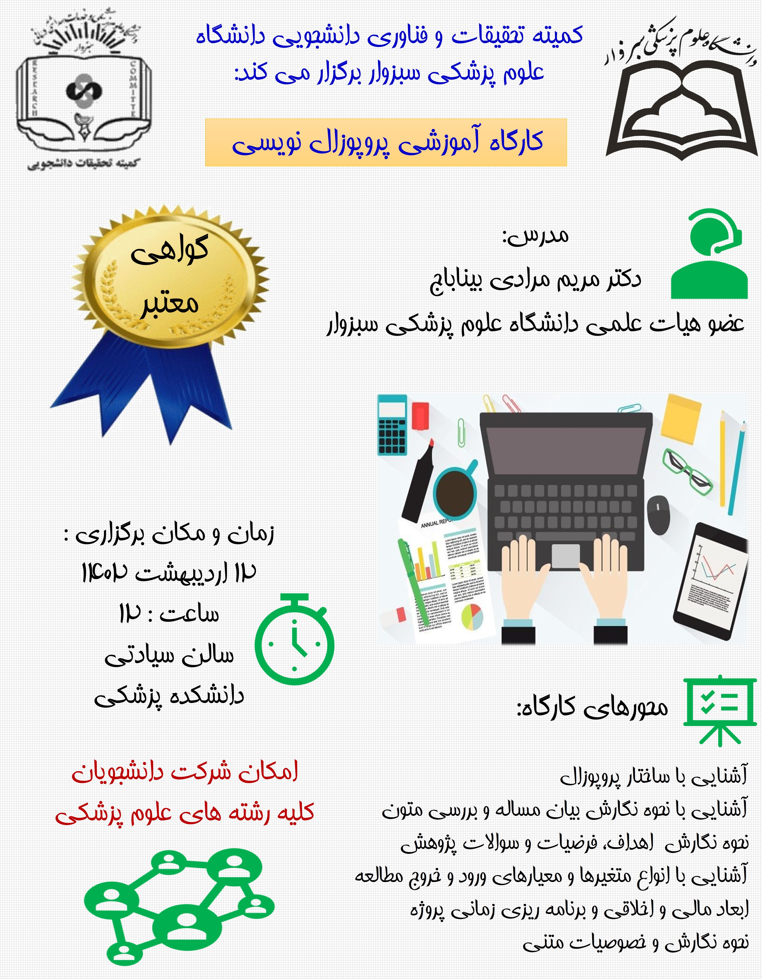 کمیته تحقیقات دانشجویی کارگاه آموزشی پروپوزال نویسی کارگاه آموزشی پروپوزال نویسی با تدریس دکتر مریم مرادی بیناباج برگزار خواهد شد