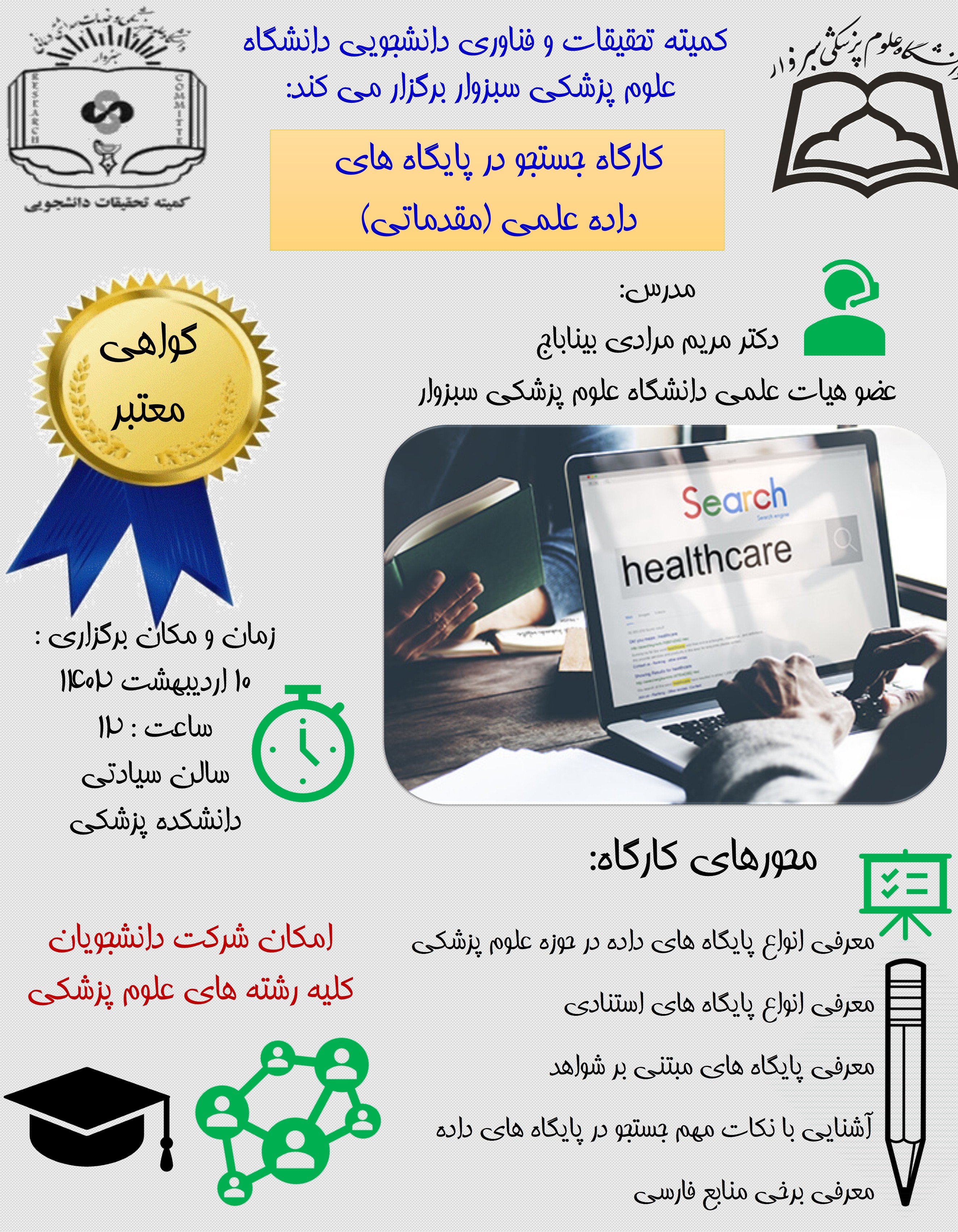 کمیته تحقیقات دانشجویی کارگاه جستجو در پایگاه های داده علمی (مقدماتی) کارگاه جستجو در پایگاه های داده علمی (مقدماتی) در تاریخ 10 اردیبهشت در سالن سیادتی با تدریس دکتر مرادی بیناباج برگزار می شود