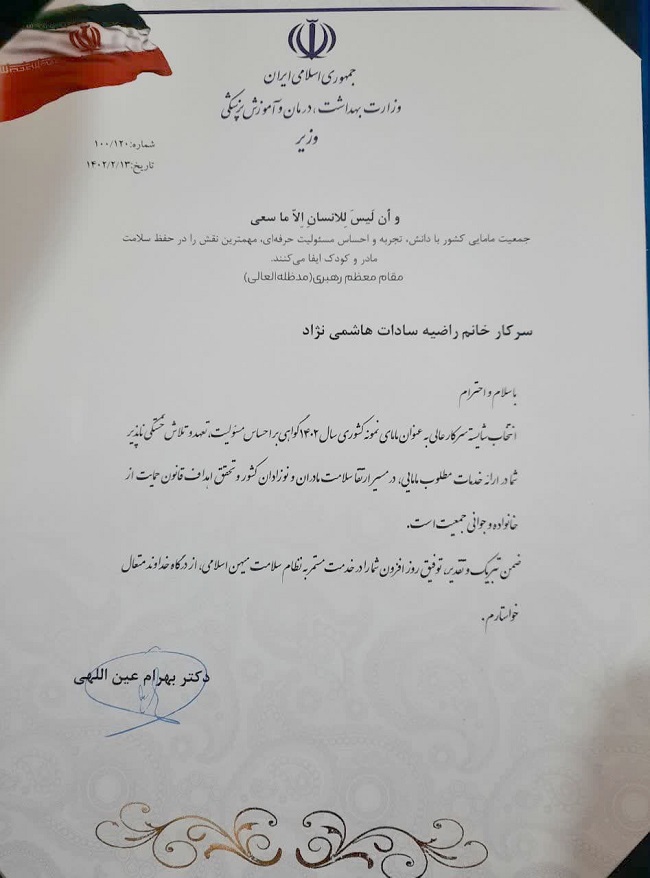 روابط عمومی شبکه بهداشت ودرمان جغتای؛ تقدیر از مامای نمونه کشوری شاغل در شبکه جغتای دکتر بهرام عین اللهی وزیر بهداشت با اهدای لوحی از سرکار خانم راضیه سادات هاشمی نژاد به عنوان مامای نمونه کشوری قدردانی کرد. به گزارش روابط عمومي شبکه بهداشت و درمان جغتای/ دکتر بهرام عین اللهی وزیر بهداشت با اهدای لوحی از سرکار خانم راضیه سادات هاشمی نژاد به عنوان مامای نمونه کشوری قدردانی کرد. متن لوح به شرح زیر است: با سلام و احترام انتخاب شایسته سرکارعالی به عنوان ماما نمونه کشوری سال 1402 گواهی بر احساس مسئولیت، تعهد و تلاش خستگی ناپذیر شما در ارائه خدمات مطلوب مامایی، درمسیر ارتقاء سلامت مادران و نوزادان کشور و تحقق اهداف قانون حمایت از خانواده و جوانی جمعیت است. ضمن تبریک و تقدیر، توفیق روز افزون شما را در خدمت مستمر به نظام سلامت میهن اسلامی، از درگاه خداوند متعال خواستارم. دکتر بهرام عین اللهی غلامرضا شرفی سرپرست شبکه بهداشت و درمان جغتای نیز در پیامی، انتخاب خانم هاشمی نژاد را به عنوان مامای نمونه کشوری تبریک گفت. متن پیام به شرح زیر است: سرکار خانم راضیه سادات هاشمی نژاد همکار معزز شاغل در مرکز خدمات جامع سلامت شماره 2 جغتای با سلام و احترام توفیق خدمت به خلق موهبتی است که به لطف خداوند متعال به شایستگی به دستان توانمند شما سپرده شده تا معنای مسئولیت و انسان دوستی را با تجلی خدمت رسانی صادقانه و مستمر جلوه گر نمایید، " انتخاب شایسته سرکار عالی را به عنوان "مامای نمونه کشوری " از سوی وزیر محترم بهداشت تبریک و تهنیت عرض می نمایم، اميد است که با استعانت از خداوند متعال و در سایه توجهات حضرت ولی عصر (عج) همواره منشاء خیر و خدمت به مردم و نظام اسلامی، و در تمام مراحل زندگی موفق و سربلند باشید. از خداوند منان سعادتمندی و توفیقات روزافزون شما را مسئلت دارم. غلامرضا شرفی سرپرست شبکه بهداشت ودرمان جغتای