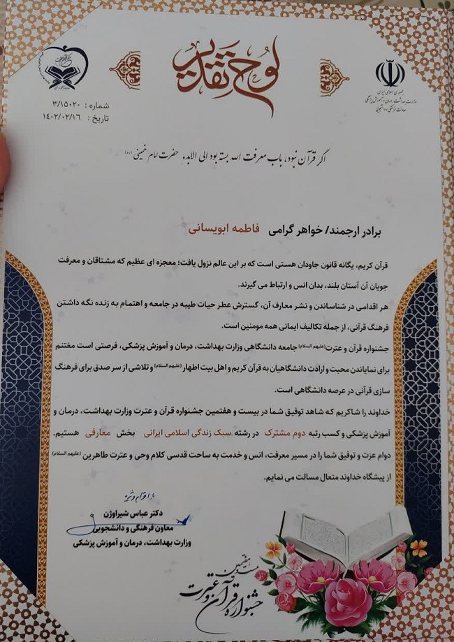 روابط عمومی شبکه بهداشت ودرمان جغتای؛ کسب رتبه دوم بخش معارفی جشنواره قرآنی وزارت بهداشت، توسط همکار شبکه جغتای معاون فرهنگی و دانشجویی وزارت بهداشت، درمان و آموزش پزشکی با اهدای لوحی از سرکار فاطمه ابویسانی به عنوان کسب رتبه دوم در رشته سبک زندگی اسلامی ایرانی بخش معارفی بیست و هفتمین جشنواره قرآنی وزارت بهداشت قدردانی کرد. به گزارش روابط عمومي شبکه بهداشت و درمان جغتای/ دکتر عباس شیراوژن معاون فرهنگی و دانشجویی وزارت بهداشت، درمان و آموزش پزشکی با اهدای لوحی از سرکار فاطمه ابویسانی به عنوان کسب رتبه دوم در رشته سبک زندگی اسلامی ایرانی بخش معارفی بیست و هفتمین جشنواره قرآنی وزارت بهداشت قدردانی کرد.متن لوح تقدیر به شرح زیر است؛ خواهرگرامی فاطمه ابویسانی قرآن کریم، یگانه قانون جاودان هستی است که بر این عالم نزول یافت؛ معجزه ای عظیم که مشتاقان و معرفت جویان آن آستان بلند، بدان انس و ارتباط می گیرند. هر اقدامی در شناساندن و نشر معارف آن، گسترش عطر حیات طیبه در جامعه و اهتمام به زنده نگه داشتن فرهنگ قرآنی، از جمله تکالیف ایمانی همه مومنین است. جشنواره قرآن و عترت (علیه السلام)جامعه دانشگاهی وزارت بهداشت، درمان و آموزش پزشکی، فرصتی است مغتنم برای نمایاندن محبت و ارادت دانشگاهیان به قرآن کریم و اهل البیت اطهار(علیه السلام) و تلاشی از سر صدق برای فرهنگ سازی قرآن در عرصه دانشگاهی است. خداوند را شاکریم که شاهد توفیق شما در بیست و هفتمین جشنواره قرآن و عترت وزارت بهداشت، درمان و آموزش پزشکی و کسبت رتبه دوم مشترک در رشته سبک زندگی اسلامی ایرانی بخش معارفی هستیم. دوام عزت و توفیق شما را در مسیر معرفت، انس و خدمت به ساحت قدسی کلام وحی و عترت طاهرین (علیه السلام) از پیشگاه خداوند متعال مسألت می نمایم. دکتر عباس شیراوژن معاون فرهنگی و دانشجویی وزارت بهداشت، درمان و آموزش پزشکی غلامرضا شرفی سرپرست شبکه بهداشت و درمان جغتای نیز در پیامی، کسب رتبه دوم توسط فاطمه ابویسانی در رشته سبک زندگی اسلامی ایرانی بخش معارفی بیست و هفتمین جشنواره قرآنی وزارت بهداشت را تبریک گفت. متن پیام به شرح زیر است: سرکار خانم فاطمه ابویسانی همکار معزز شاغل در مرکز خدمات جامع سلامت ریواده با سلام و احترام افتخار کسب رتبه در بخش معارفی بیست و هفتمین جشنواره قرآنی وزارت بهداشت نشان از تلاش، پشتکار و همت والای شماست، این دستاورد بزرگ مايه مباهات و خوشحالی اينجانب و مجموعه كاركنان شبكه بهداشت و درمان جغتای گردید. اینجانب کسب رتبه دوم توسط سرکارعالی در رشته سبک زندگی اسلامی ایرانی بخش معارفی وزارت بهداشت، درمان و آموزش پزشکی کشور را به شما و خانواده محترمتان که در این موفقیت ارزشمند، همراه و پشتیبان شما بودهاند، صمیمانه تبریک عرض میکنم. اميد است در سايه قرآن کریم و اهل البیت (علیه السلام) همواره در مسير خدمت به نظام مقدس جمهوری اسلامی و مردم شريف، در تمام مراحل زندگی موفق و سربلند باشید. از خداوند منان سعادتمندی و توفیقات روزافزون شما را مسئلت دارم. غلامرضا شرفی سرپرست شبکه بهداشت ودرمان جغتای