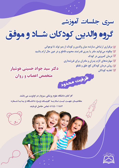 برگزاری جلسات آموزشی گروهی والدین کودکان شاد وموفق برگزاری جلسات آموزشی گروهی والدین کودکان شاد وموفق جلسات آموزشی گروهی والدین کودکان شاد وموفق سه شنبه ها ساعت9:30الی11توسط دکترسیدجوادحسینی وشیار در محل کلینیک ویژه دانشگاه علوم پزشکی سبزوار برگزار می گردد.جهت ثبت نام با شماره تلفن05144011552تماس حاصل فرمایید.