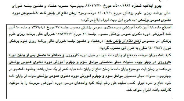 روابط عمومی معاونت آموزشی دانشگاه؛ در خصوص زمان دفاع از پایان نامه دانشجویان دوره دکتری عمومی پزشکی اصلاحیه ابلاغ مصوبه جلسه 86 مورخ 1401/12/14 شورای عالی برنامه ریزی علوم پزشکی در خصوص زمان دفاع از پایان نامه دانشجویان دوره دکتری عمومی پزشکی