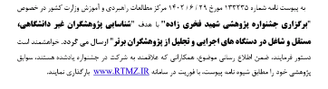 روابط عمومی معاونت تحقیقات و فناوری دانشگاه؛ برگزاری جشنواره پژوهشی شهید فخری زاده جشنواره پژوهشی شهید فخری زاده لینک شیوه نامه: https://www.medsab.ac.ir/uploads/شیوه_نامه.pdf
