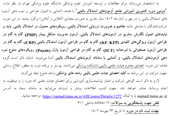 روابط عمومی معاونت آموزشی دانشگاه؛ آموزش جامع آزمون های استدلال بالینی فراخوان دوره کشوری "آموزش جامع آزمون های استدلال بالینی" - دانشگاه های علوم پزشکی کشور