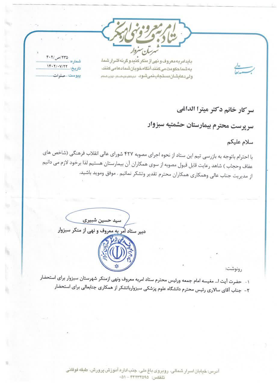 تقدیر ستاد امر و به معروف نهی از منکر شهرستان از عملکرد مطلوب بیمارستان حشمتیه
