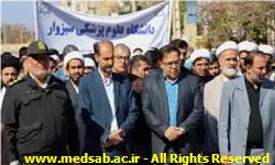 به گزارش وبدا/ رییس دانشگاه علومپزشکی سبزوار به همراه معاونین، جمعی از اساتید، کارکنان و دانشجویان دانشگاه در اجتماع بزرگ دانشگاهیان در محکومیت جنایت ددمنشانه رژیم غاصب اسرائیل و دفاع از مردم مظلوم فلسطین شرکت کردند.