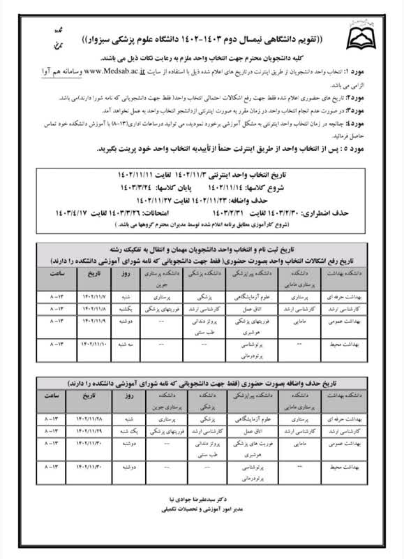 روابط عمومی معاونت آموزش دانشگاه؛ تقویم آموزشی نیمسال دوم ۱۴۰۲_۱۴۰۳ دانشگاه علوم پزشکی سبزوار