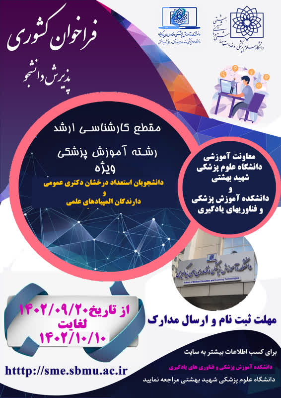 روابط عمومی معاونت آموزش دانشگاه؛ تحصیل هم زمان دانشجویان ممتاز و استعداد درخشان و اعضای هیات علمی تحصیل هم زمان دانشجویان ممتاز و استعداد درخشان و اعضای هیات علمی در رشته کارشناسی ارشد آموزش پزشکی (مجازی) تحصیل هم زمان دانشجویان ممتاز و استعداد درخشان و اعضای هیات علمی لینک ثبت نام دانشجویان: https://medsab.ac.ir/uploads/پذیرش_دانشجوی_ارشد.pdf لینک ثبت نام اعضای هیات علمی https://medsab.ac.ir/uploads/شیوه_نامه_ثبت_نام.pdf