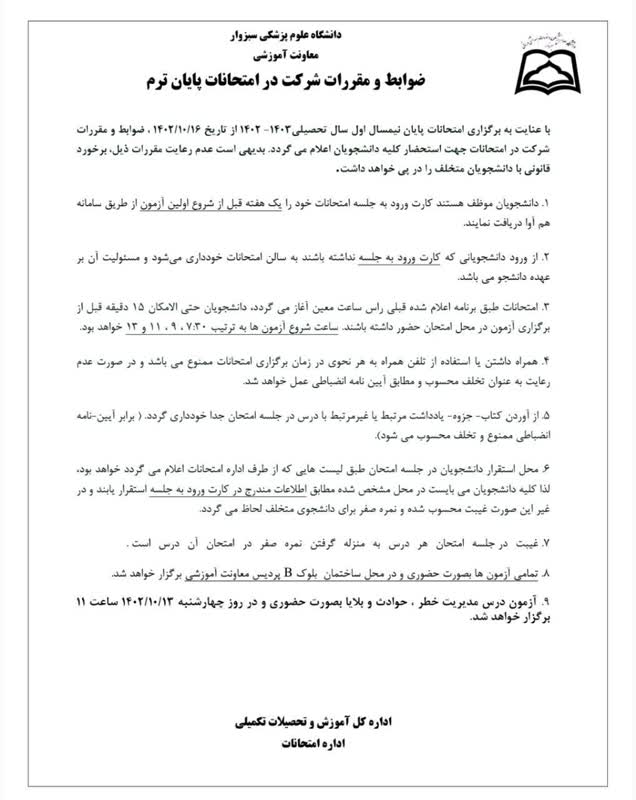 روابط عمومی معاونت آموزش دانشگاه؛ ضوابط و مقررات شرکت در امتحانات پایان ترم ضوابط و مقررات شرکت در امتحانات پایان ترم نیمسال اول ۱۴۰۲ _ ۱۴۰۳ دانشگاه علوم پزشکی سبزوار ضوابط و مقررات شرکت در امتحانات پایان ترم نیمسال اول ۱۴۰۲ _ ۱۴۰۳ دانشگاه علوم پزشکی سبزوار