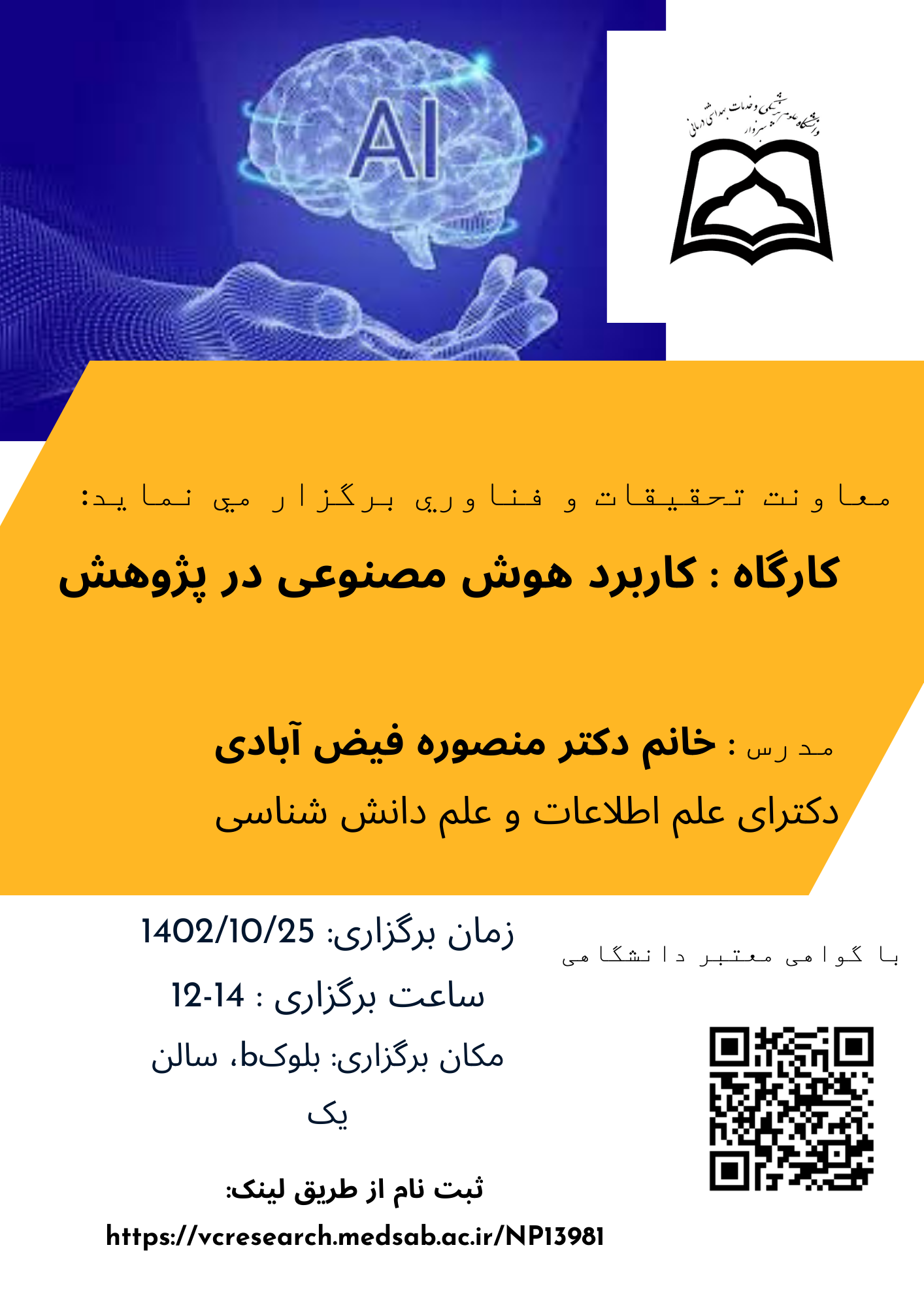 معاونت تحقیقات و فناوری معاونت تحقیقات و فناوری برگزار میکند: کارگاه کاربرد هوش مصنوعی در پژوهش زمان برگزاری: 25/10/1402 ساعت برگزاری : 14-12 مکان برگزاری: بلوک B- سایت یک ثبت نام از طریق لینک: https://www.medsab.ac.ir/NP13981 با گواهی معتبر دانشگاهی