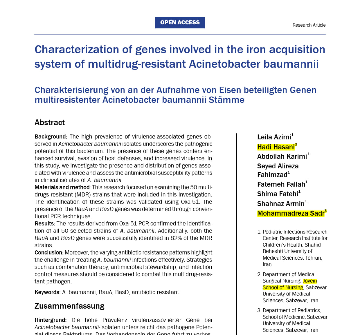 روابط عمومی دانشکده پرستاری جوین چاپ مقاله اولین طرح مصوب شورای پژوهشی دانشکده پرستاری جوین در مجلات معتبر جهانی این مقاله که در خصوص مقاومت یک نوع باکتری به آنتی بیوتیک ها بود در سال 2024 در ژورنال GMS به چاپ رسید. به گزارش روابط عمومی دانشکده پرستاری جوین دکتر صدر (رئیس دانشکده پرستاری جوین) بیان داشت: این مقاله که در خصوص مقاومت یک نوع باکتری به آنتی بیوتیک ها بود در سال 2024 در ژورنال GMS با افیلیشن (وابستگی سازمانی) دانشکده پرستاری جوین به چاپ رسید. وی افزود: این تحقیق با همکاری پژوهشگران دانشکده پرستاری جوین و دانشگاه علوم پزشکی شهید بهشتی تهران (بیمارستان مفید) انجام شد و هم چنین سه طرح دیگر دانشکده به پایان رسیده و در مرحله چاپ مقاله می باشد و 24 طرح دیگر نیز با همکاری دانشگاه های علوم پزشکی سبزوار، تهران و یزد در حال اجرا است.