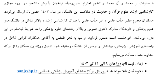 روابط عمومی پردیس دانشگاه؛ فراخوان پذیرش دانشجو در دوره مجازی فراخوان پذیرش دانشجو در دوره مجازی کارشناسی ارشد علوم قرآن و حدیث در سلامت