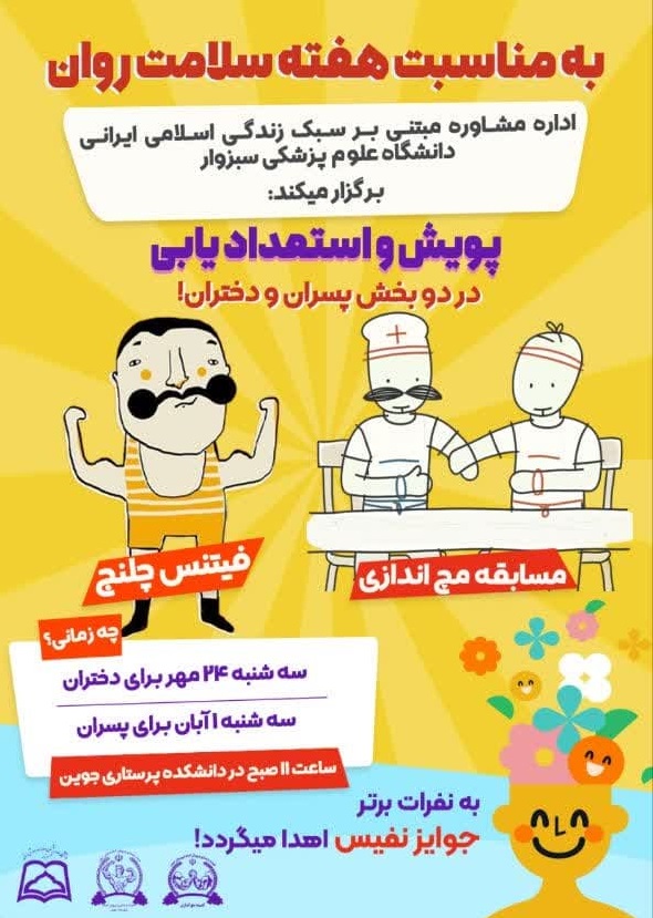 روابط عمومی دانشکده پرستاری جوین به مناسبت هفته سلامت روان برگزار می گردد اداره مشاوره مبتنی بر سبک زندگی اسلامی ایرانی دانشگاه علوم پزشکی سبزوار برگزار می کند: پویش و استعدادیابی در دو بخش پسران و دختران