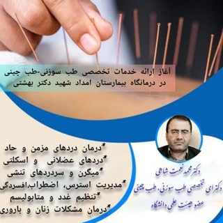 آغاز ارائه خدمات درمانی تخصصی «طب سوزنی_طب چینی» در درمانگاه بیمارستان امداد شهید دکتر بهشتی این خدمات تخصصی شامل: ▪️درمان دردهای مزمن و حاد ▪️دردهای عضلانی و اسکلتی (درد گردن ، کمر و ستون فقرات، زانو، آرتروز و بیماری های روماتیسمی ) ▪️میگرن و سردردهای تنشی و... ▪️مدیریت استرس ، اضطراب و افسردگی ▪️تنظیم غدد و متابولیسم ؛ اختلالات خواب ▪️درمان مشکلات زنان و باروری (تنظیم چرخههای قاعدگی نامنظم کاهش علائم سندرم پیش از قاعدگی یا PMS) نوبت دهی جهت آقای دکتر محمد نعمت شاهی، «دکترای تخصصی طب سوزنی_طب چینی» و عضو هیئت علمی دانشگاه: / صبح روزهای چهارشنبه هر هفته / نوبتگیری از طریق مراجعه حضوری و سامانه ”پذیرش۲۴” و تماس با شماره ۰۵۱۴۴۶۴۰۱۱۵ _داخلی ۷۲۹۱ امکانپذیر است.