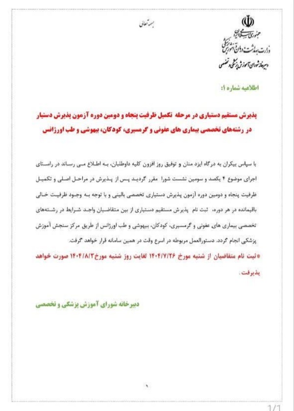 پذیرش مستقیم دستیاری در مرحله تکمیل ظرفیت پذیرش مستقیم دستیاری در مرحله تکمیل ظرفیت پنجاه و دومین دوره آزمون پذیرش دستیار در رشته های تخصصی بیماریهای عفونی، کودکان، بیهوشی و طب اورژانس به اطلاع می رساند: در راستای اجرای موضوع 4 یکصد و سومین نشست شورا مقرر گردید پس از پذیرش در مرحله اصلی و تکمیل ظرفیت پنجاه و دومین دوره آزمون پذیرش دستیاری تخصصی بالینی و با توجه به وجود ظرفیت خالی باقیمانده در هردوره ، ثبت نام پذیرش مستقیم دستیاری از بین متقاضیان واجد شرایط در رشته های تخصصی بیماریهای عفونی ، کودکان، بیهوشی وطب اورژانس از طریق مرکز سنجش پزشکی انجام گردد.دستورالعمل مربوطه در اسرع وقت در اطلاعیه بعدی در همین سامانه قرارخواهد گرفت. ** ثبت نام متقاضیان از شنبه مورخ 26 مهر ماه لغایت روز شنبه مورخ 3 آبان ماه سال 1404 صورت خواهد پذیرفت.