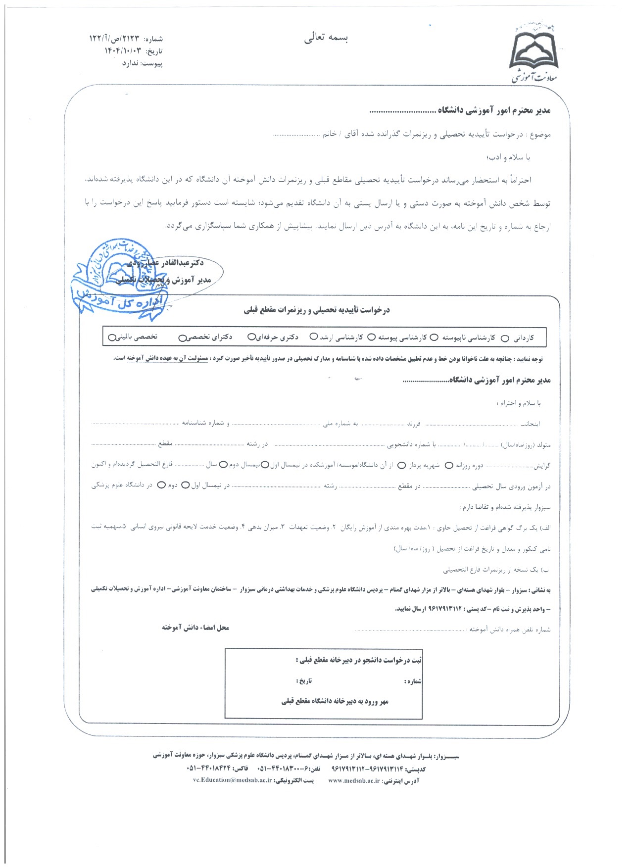 تذکر2: محتوای گواهی ارائه شده جهت موافقت با ثبت نام و ادامه تحصیل بایستی بدون بیان قید و شرط از سوی اداره مربوطه باشد.