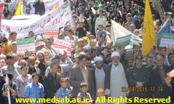 در روزجمعه مورخه 1394/4/19مصادف با بیست وسوم ماه مبارک رمضان ، به مناسبت روزجهانی قدس ودرحمایت ازمردم مظلوم فلسطین ، کارکنان شبکه بهداشت ودرمان ، پرسنل بیمارستان ولی عصر(عج)وبسیجیان کانون بسیج جامعه پزشکی شهرستان جغتای به همراه دیگر اقشارمردم با شرکت در راهپیمایی روزقدس ومراسم باشکوه نمازجمعه ، ضمن تجدید میثاق باولایت وآرمانهای انقلاب اسلامی ، برائت خودرااز اسرائیل غاصب ،آمریکا وکشورهای هم پیمان آنها اعلام نمودند.
