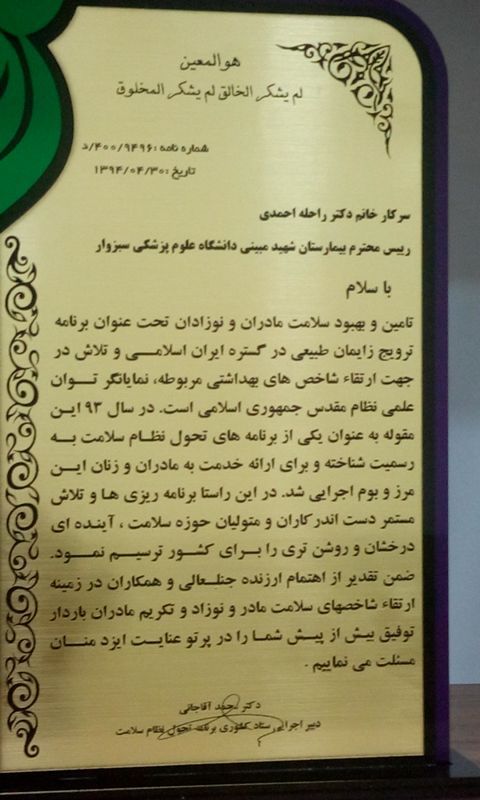 دراین مراسم  دکتر هاشمی وزیر بهداشت  و دکتر آقاجانی دبیراجرایی ستادکشوری برنامه تحول نظام سلامت باحضور درغرفه نمایشگاهی دانشگاه علوم پزشکی سبزوار ضمن تقدیروتشکر اززحمات ریاست  و پرسنل بیمارستان تندیس زرین  راکه مربوط به  ترویج زایمان طبیعی بودرابه خانم دکتر احمدی رئیس مرکز آموزشی درمانی شهیدان مبینی   اهداکردند./ 170