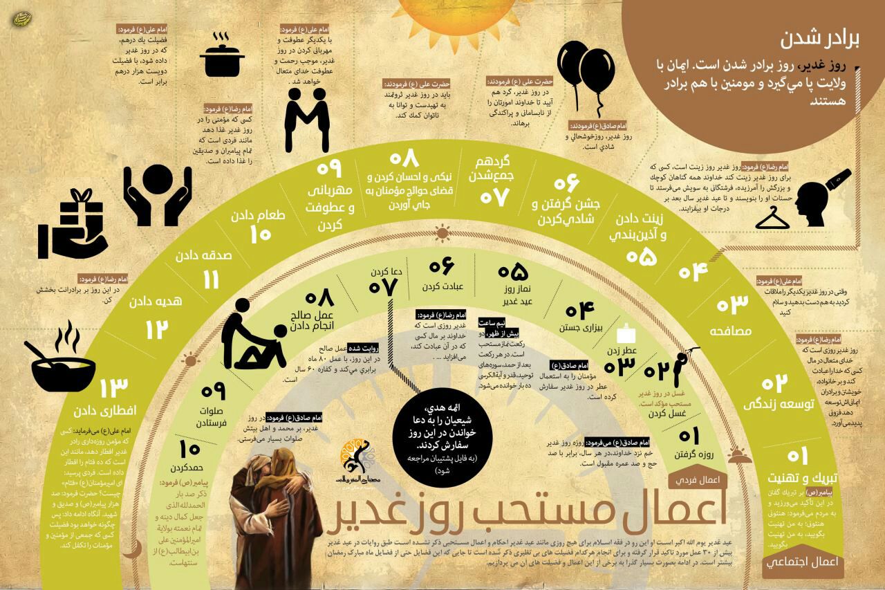 عید غدیر خم، با نصب امیرالمؤمنین حضرت علی (علیهالسلام) به ولایت و امامت روز تکمیل دین اسلام و بزرگترین عید اسلامی است. اهمیت غدیر در روایات اهلبیت (علیهمالسلام) به اندازهای است که از آن به عیدالله الاکبر (عید بزرگتر الهی) یاد شده است. این روز پرعظمت و مبارک دارای احکام استحبابی ویژه و فراوانی است که در این داده نمای ارزشمند به نمونههایی از آنها همراه با برخی توضیحات پرداخته شده است.
