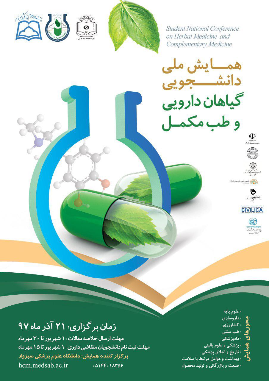 علوم پایه -مطالعات حیوانی -گیاه شناسی، فیتوشیمی – بیوشیمی، فیزیولوژی – ژنتیک – بیوتکنولوژی و اثرات بیولوژیک علوم بالینی، بهداشت و عوامل مرتبط با سلامت بیماری های غیر واگیر اصلاح سبک زندگی پیشگیری و عوامل مرتبط با سلامت داروسازی، طب سنتی، دامپزشکی – اثرات فارماکولوژیک -توکسیکولوژی – اثرات بالینی – فرمولاسیون و کنترل علوم کشاورزی – اکولوژی و فیزیولوژی گیاهی – تکنولوژی بذر – اهلی کردن و اصلاح – بیوتکنولوژی گیاهی – کشت و زراعت صنعت و بازرگانی و تولید محصول – تولید فراورده های گیاهان دارویی - تجاری سازی گیاهان دارویی – نوآوری در تولید محصول – انتقال تکنولوژی و تولید محصولات گیاهی برگزارکننده: دانشگاه علوم پزشکی سبزوار