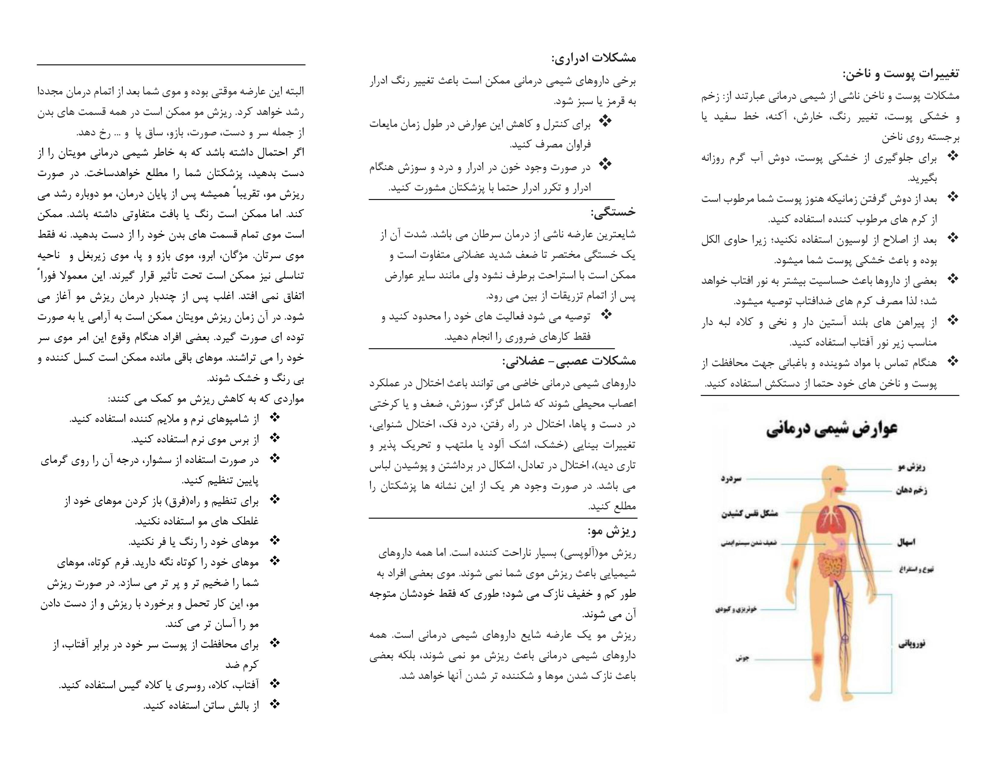مواردی که بیماران در طی شیمی درمانی باید رعایت کنند 1)شستشوی مرتب دستها با آب و صابون 2)شستشوی دهان و دندان با مسواک نرم 3)مصرف میوه غیر قابل پوست کردن مثل توت فرنگی ،انگور و ...ممنوع است 4)سبزی خام و کاهو ممنوع است 5)از مواجهه با افراد سرماخورده و یا افرادیکه اسهال و استفراغ دارند پرهیز کنید. 6)ملاقات افراد با جمعیت زیاد ممنوع است (حتی در ملاقات ماسک استفاده شود ) 7)غذاهای کنسرو شده و تن ماهی ممنوع است. 8)خوردن غذای مانده ممنوع است. 9)سوسیس و کالباس و پیتزا و ساندویچ ممنوع است. 11)بیمار می تواند از میوه هایی که می توان پوست انها را جدا کرد استفاده نماید مثل پرتقال ،سیب ،نارنگی ،لیمو شیرین ،کیوی و گلابی و..... 11)مصرف اب هویج و مواد خام ممنوع است. همکار محترم پرستاری بیمارستان با توجه به دستورالعمل جامع خودمراقبتی و آموزش بیمار،الزامی است آموزش بیمار حین بستری و ترخیص شیمی درمانی طبق این دستورالعمل و حداقل محتوای زیر انجام گیرد توصیه های بعد از انجام شیمی درمانی 1-براي پيشگيري از حالت تهوع و استفراغ لازم است دو ساعت قبل از شيمي درماني و بعد از شيمي درماني غذايي مصرف نشود 2-بهتر استاولين مواد غذايمصرفيبعد از شيمي درمانيشاملمايعاتياز قبيل شير، چاي سرد باشد. 3-طبق دستور پزشک معالج قبل از شيمي درماني داروهاي ضد تهوع دريافت کنند. 4- از مصرف گوشت قرمز در سه روز اولشروع شيمي درماني خودداري نماييدوبه جاي آن گوشتهاي سفيد مصرفکنيد. 5- براي کاهش حالت تهوع لازم است دريافت غذاي کافي ومقويرا افزايش داده و در کنار آن، استراحت وخواب مناسب وکافي، تمرين و فعاليت بدني، تغيير ذهنيت بوسيله مطالعه، ديدن تلويزيون، صحبت هاي خودماني و .... را داشته باشيد. 6- بعد از اتمام هر جلسه شيمي درماني مايعات فراوان ميل کنيد تا با دفعزيادادرار عوارض داروها کاهش يابد.حداقل ميزان دريافت مايعات 10 ليوان در شبانه روز باشد. انواع آب ميوهطبيعيودوغ نوشيدنيهاي مناسبي محسوب ميشوند.. 7- تقريبا به مدت 2 ساعت بعد از شيمي درماني به صورت خوابيده و نيمه نشسته استراحت کنيد وسپس از جاي خود بلند شويد . ابتدا بنشينيد و پاهاي خود را از تخت آويزان کنيد اگر سرگيجه نداشتيد از تخت خارج شويد. 8-در صورت استفاده از داروهاي خوراکي شيمي درماني آنها را به همراه شير و يا شربت آنتي اسيد مصرف کنيد. داروهاي شيمي درماني خود را در منزل حتما دربيخچال نگهداري کنيد. 9- داروهارا به طور مرتب و به موقع مصرف نماييد. 10- آزمايشات خود را به طور مرتب انجام دهيد و پاسخ آنهارا نگهداري نماييد. 11- محل تزريق آمپولهاي شيمي درمانيرا از هرگونه آسيب محفوظ داريد. 12- در صورت ايجاد درد، ترشح چرکي و تورم در محل تزريق دارو به پزشکمراجعه نماييد. 13- در زمان شيمي درماني از قرص آسپرين و گروه ساليسيلاتها و ايندومتاسين ، مفناميک اسيد، بروفن، ديکلوفناک، پيروکسيکام استفاده نکنيدمگر با دستور پزشک معالج 14-با توجه به اينکه بيماراني که شيمي درماني مي شوند مشکل پلاکت دارند به هيچ عنوان از شياف استفاده نکنند. زمان مراجعه بعدی 1-در فواصل منظم و تعيين شده جهت ادامه درمان به پزشک مراجعه نماييد. 2- در طول درمانهاي طولاني مدت اگر با ناراحتي تنفسي نظير تنگي نفس و خس خس سينه يا سرفه مواجه شديد به پزشک معالج رجوع کنيد. 3- در صورت خونريزي از لثه، وجود مدفوع سياه رنگ، خون در ادرار، خلط خوني به پزشک مراجعه نماييد.