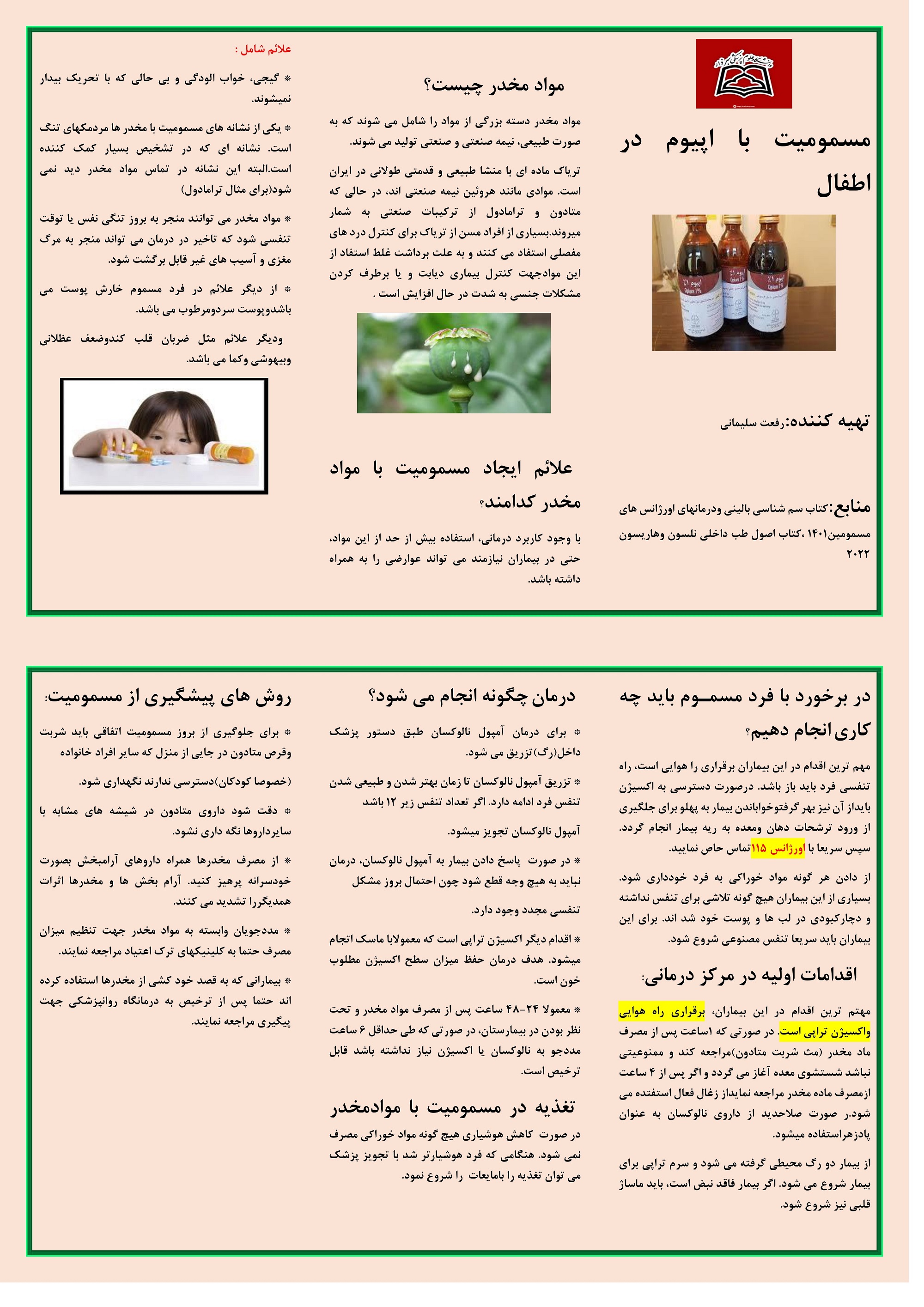 مواد مخدر چيست؟ مواد مخدر دسته بزرگي از مواد را شامل مي شوند كه به صورت طبيعي، نيمه صنعتي و صنعتي توليد مي شوند. ترياك ماده ای با منشا طبيعي و قدمتي طولاني در ایران است. موادی مانند هروئين نيمه صنعتي اند، در حالي كه متادون و ترامادول از تركيبات صنعتي به شمار ميروند.بسياری از افراد مسن از ترياك برای كنترل درد های مفصلي استفاد مي كنند و به علت برداشت غلط استفاد از اين موادجهت كنترل بيماری ديابت و يا برطرف كردن مشكلات جنسي به شدت در حال افزایش است. عالئم ايجاد مسموميت با مواد مخدر كدامند؟ با وجود كاربرد درماني، استفاده بیش از حد از اين مواد، حتی در بيماران نيازمند مي تواند عوارضي را به همراه داشته باشد. علائم شامل : * گيجي، خواب الودگي و بي حالي كه با تحریک بیدار نمیشوند. * يكي از نشانه های مسموميت با مخدر ها مردمكهای تنگ است. نشانه ای كه در تشخيص بسيار كمک کننده است.البته اين نشانه در تماس مواد مخدر ديد نمي شود(برای مثال ترامادول) * مواد مخدر مي توانند منجر به بروز تنگي نفس يا توقت تنفسي شود كه تاخير در درمان مي تواند منجر به مرگ مغزی و آسيب های غير قابل برگشت شود. * از ديگر علائم در فرد مسموم خارش پوست مي باشدوپوست سردومرطوب می باشد. ودیگر علائم مثل ضربان قلب کندوضعف عظلانی وبیهوشی وکما می باشد. در برخورد با فرد مسمـوم بايد چه كاري انجامدهيم؟ مهم ترين اقدام در اين بيماران برقراری را هوايي است، راه تنفسي فرد بايد باز باشد. درصورت دسترسي به اكسيژن بايداز آن نيز بهر گرفتوخواباندن بیمار به پهلو برای جلگیری از ورود ترشحات دهان ومعده به ریه بیمار انجام گردد. سپس سريعا با اورژانس 115تماس حاص نماييد. از دادن هر گونه مواد خوراكي به فرد خودداری شود. بسياری از اين بيماران هيچ گونه تلاشي برای تنفس نداشته و دچاركبودی در لب ها و پوست خود شد اند. برای اين بیماران بايد سريعا تنفس مصنوعي شروع شود. اقدامات اوليه در مركز درماني: مهتم ترين اقتدام در اين بيماران، برقراری راه هوايي واكسيژن تراپي است. در صورتي كه 1ساعت پس از مصرف ماد مخدر (مث شربت متادون)مراجعه كند و ممنوعیتی نباشد شستشوی معده آغاز مي گردد و اگر پس از 4 ساعت ازمصرف ماده مخدر مراجعه نمایداز زغال فعال استفتده می شود.ر صورت صلاحديد از داروی نالوكسان به عنوان پادزهراستفاده ميشود. از بيمار دو رگ محيطي گرفته مي شود و سرم تراپي برای بيمار شروع مي شود. اگر بيمار فاقد نبض است، بايد ماساژ قلبي نيز شروع شود. درمان چگونه انجام مي شود؟ * برای درمان آمپول نالوكسان طبق دستور پزشک داخل(رگ)تزريق مي شود. * تزريق آمپول نالوكسان تا زمان بهتر شدن و طبیعی شدن تنفس فرد ادامه دارد. اگر تعداد تنفس زير 12 باشد آمپول نالوكسان تجويز ميشود. * در صورت پاسخ دادن بيمار به آمپول نالوکسان، درمان نبايد به هيچ وجه قطع شود چون احتمال بروز مشكل تنفسي مجدد وجود دارد. * اقدام ديگر اكسيژن تراپي است كه معمولابا ماسک اتجام ميشود. هدف درمان حفظ ميزان سطح اكسيژن مطلوب خون است. * معمولا 24-48 ساعت پس از مصرف مواد مخدر و تحت نظر بودن در بيمارستان، در صورتي كه طي حداقل 6 ساعت مددجو به نالوكسان يا اكسيژن نياز نداشته باشد قابل ترخيص است. تغذيه در مسموميت با موادمخدر در صورت كاهش هوشياری هيچ گونه مواد خوراكي مصرف نمي شود. هنگامي که فرد هوشيارتر شد با تجويز پزشک مي توان تغذيه را بامايعات را شروع نمود. روش هاي پيشگيري از مسموميت: * برای جلوگيری از بروز مسموميت اتفاقي بايد شربت وقرص متادون در جايي از منزل كه ساير افراد خانواده (خصوصا کودکان)دسترسي ندارند نگهداری شود. * دقت شود داروی متادون در شيشه های مشابه با سايرداروها نگه داری نشود. * از مصرف مخدرها همراه داروهای آرامبخش بصورت خودسرانه پرهيز كنيد. آرام بخش ها و مخدرها اثرات همديگررا تشديد مي كنند. * مددجويان وابسته به مواد مخدر جهت تنظيم ميزان مصرف حتما به كلينيكهای ترك اعتياد مراجعه نمايند. * بيماراني كه به قصد خود كشي از مخدرها استفاده كرده اند حتما پس از تر