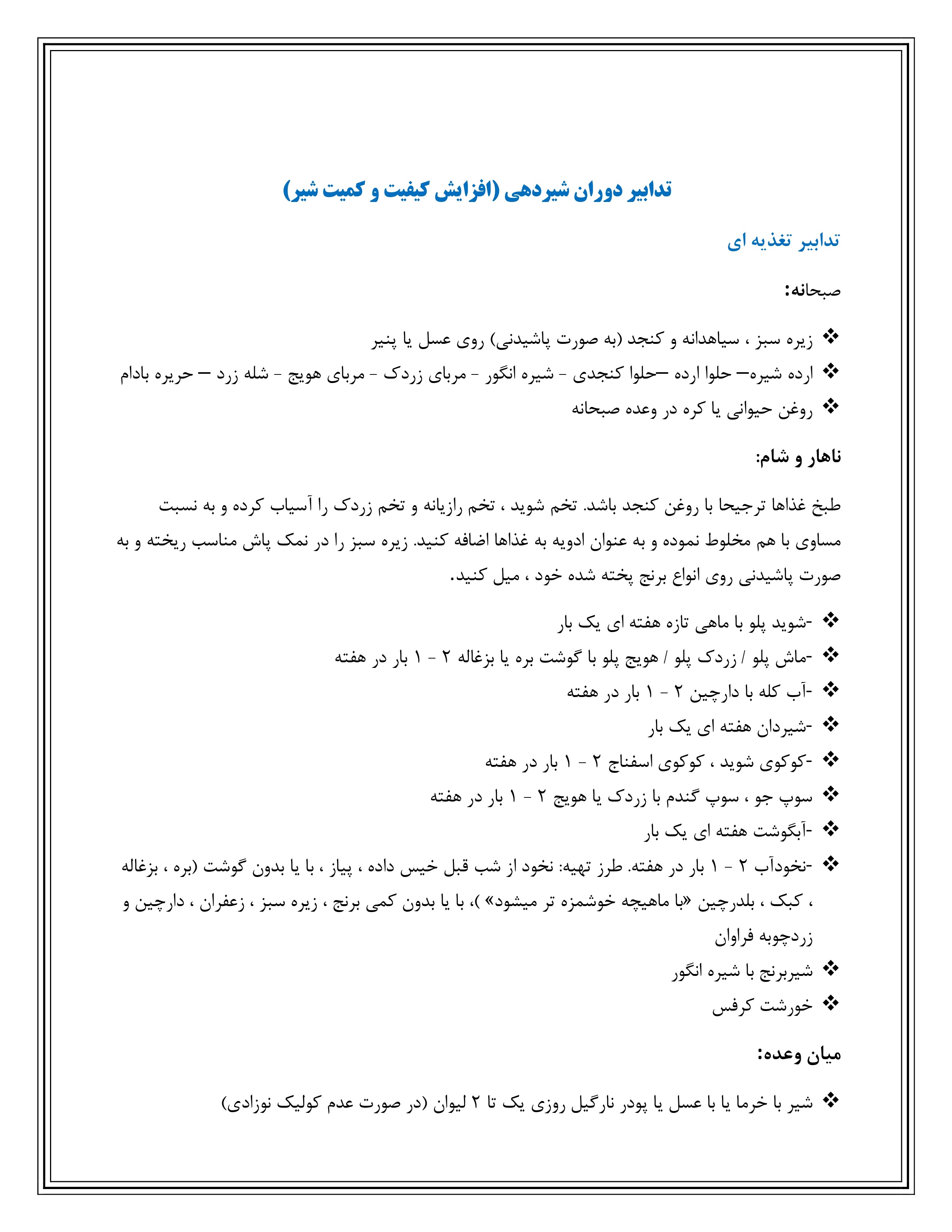 نکته:اگر نوزاد در شبانه روز هر 2-3 ساعت شیر بخورد و 6-8 بار پوشک خود را کاملا خیس کند و هر روز 30 گرم وزن بگیرد خوب تغذیه شده است.با افزایش سن دفعات تغذیه کم می شود.
